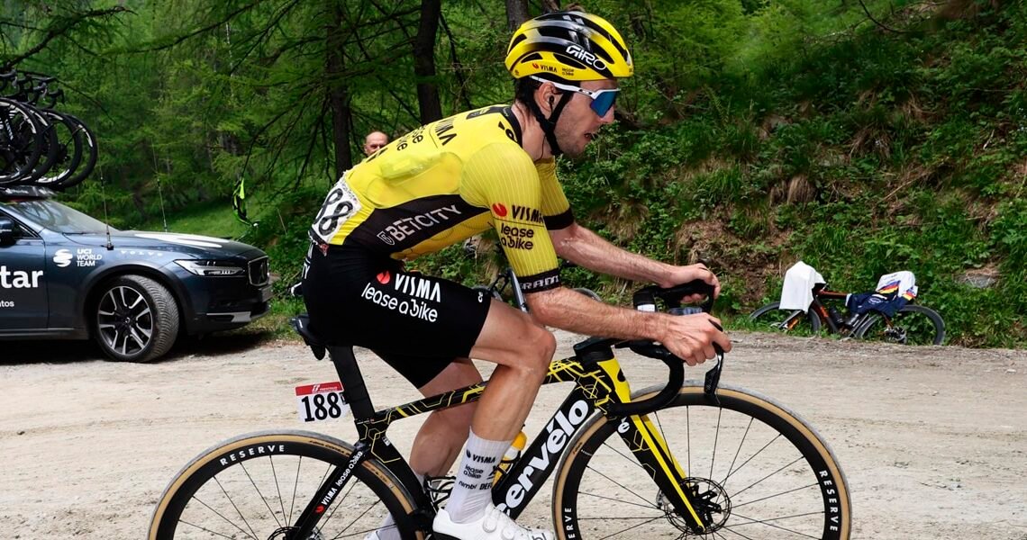 The lead of the escapees increased again to the start of the Colle delle Finestre, up to 10 minutes. Among the leaders, at the front there was a duel between Van Aert and De Bondt at the intermediate sprint. Van Aert won, but De Bondt was second and Pedersen didn’t get involved. The Dane then went on the front for his teammate, Carlos Verona on the first kilometres of the Finestre. Pedersen’s work helped Verona, Bilbao and others to break away.