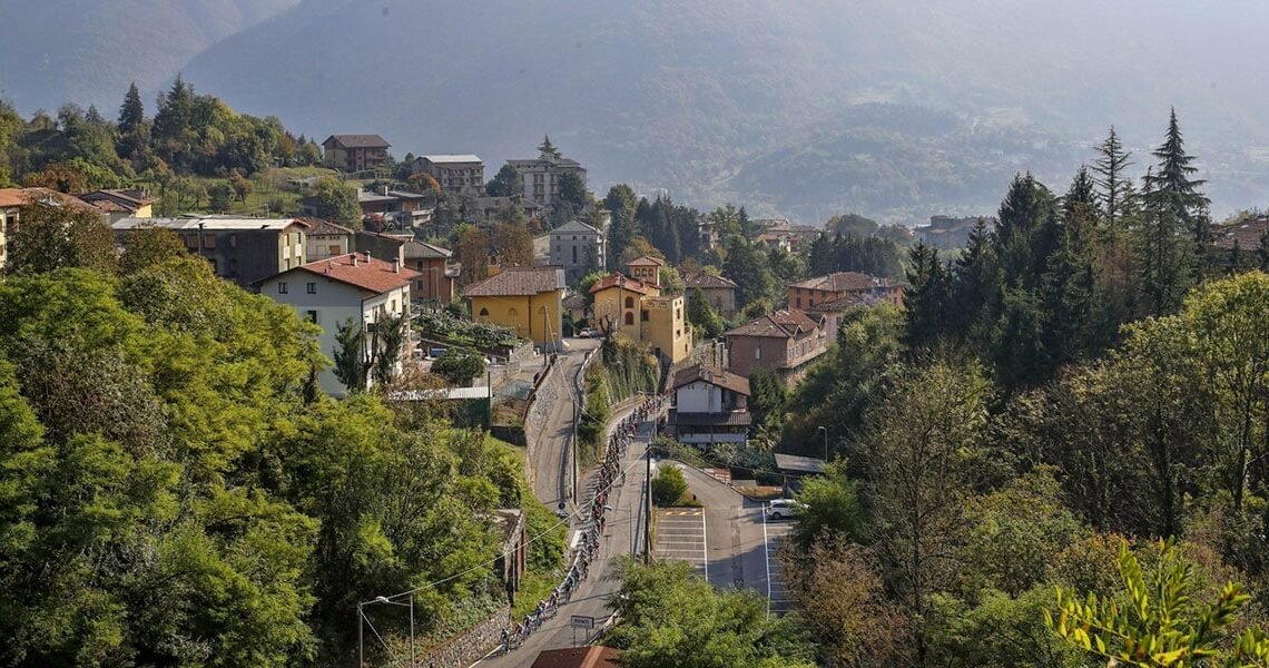The race starts in Como and quickly (after about 35km of rolling terrain) hits the Madonna del Ghisallo climb from the easier Asso side (8.8km at 3.9%), the climb that shares its fame with the shrine of Madonna del Ghisallo, the patroness of cyclists. The race then descends that iconic hill and heads along the shores of Lake Como, where the serious climbing is paused until the race enters the pre-Alpine hills of the Bergamo region at about 100km into the race.